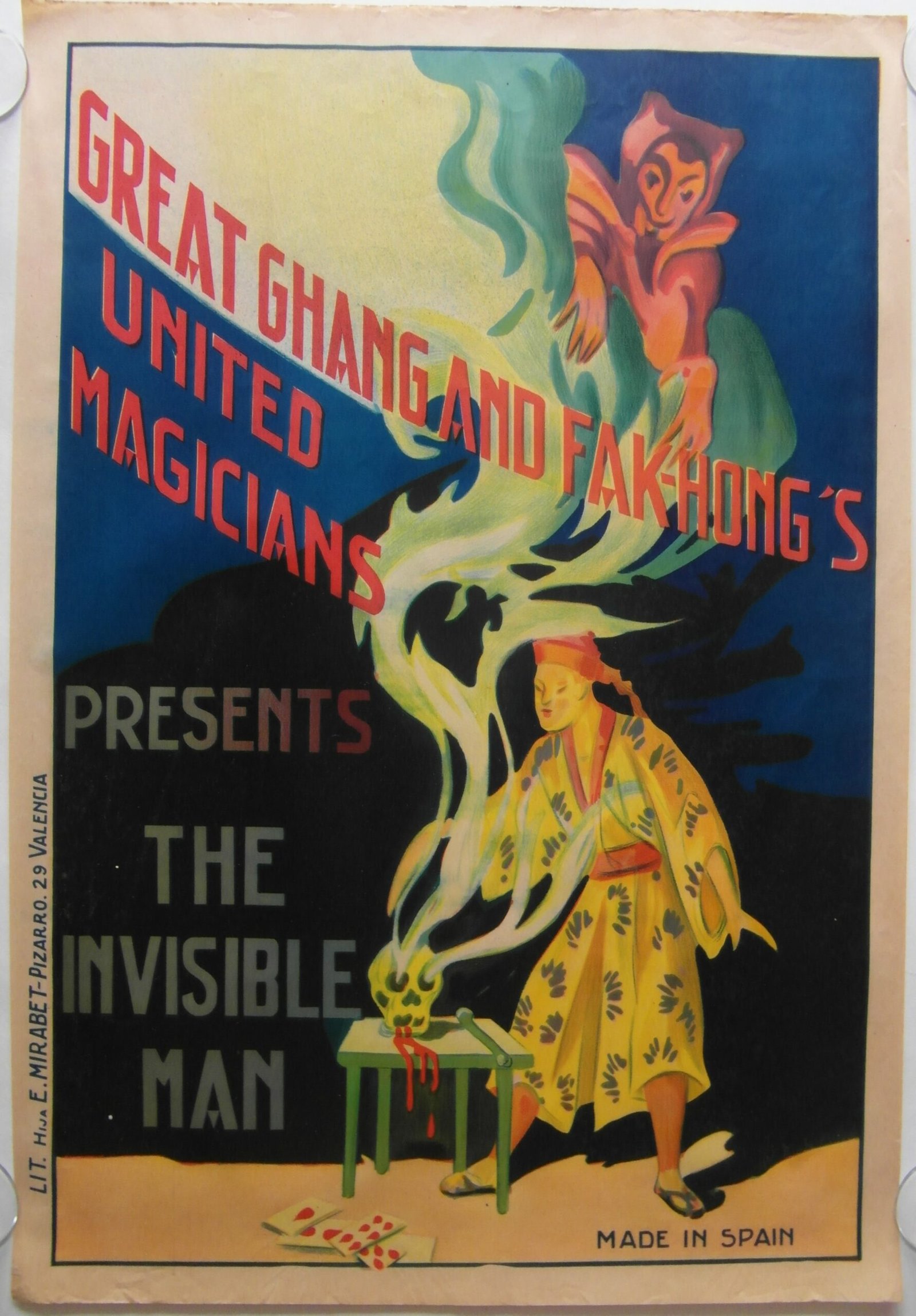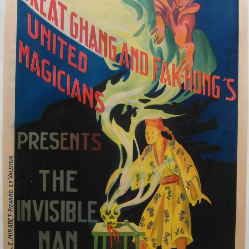 Original Spanish advertising poster for Great Ghang and Fak Hong’s travelling magician show, a duo of Western illusionists who toured Europe during the 1930s. A beautiful stone lithograph with striking colours.