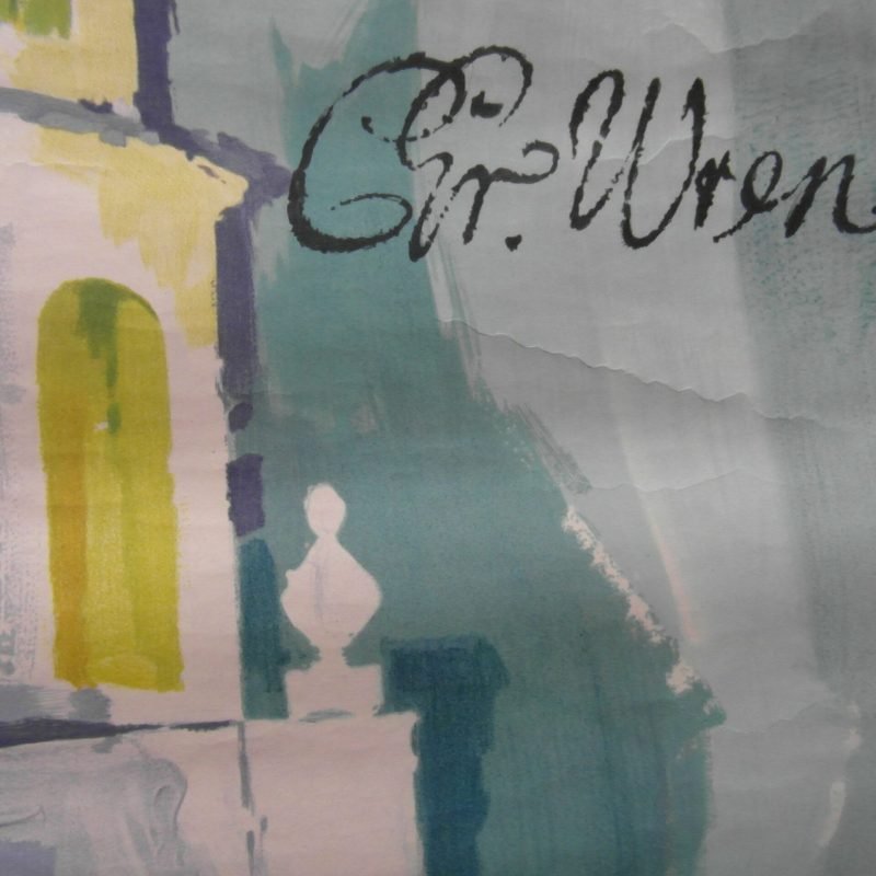 Original 1957 London Underground Poster promoting the architecture of Sir Christopher Wren by Hans Unger, celebrated German graphic designer and mosaic artist. Unger was involved in poster art from 1953-1977. Sir Christopher Wren [1632-1723] was one of the most highly acclaimed English architects in history, as well as an anatomist, astronomer, geometer, and mathematician-physicist.